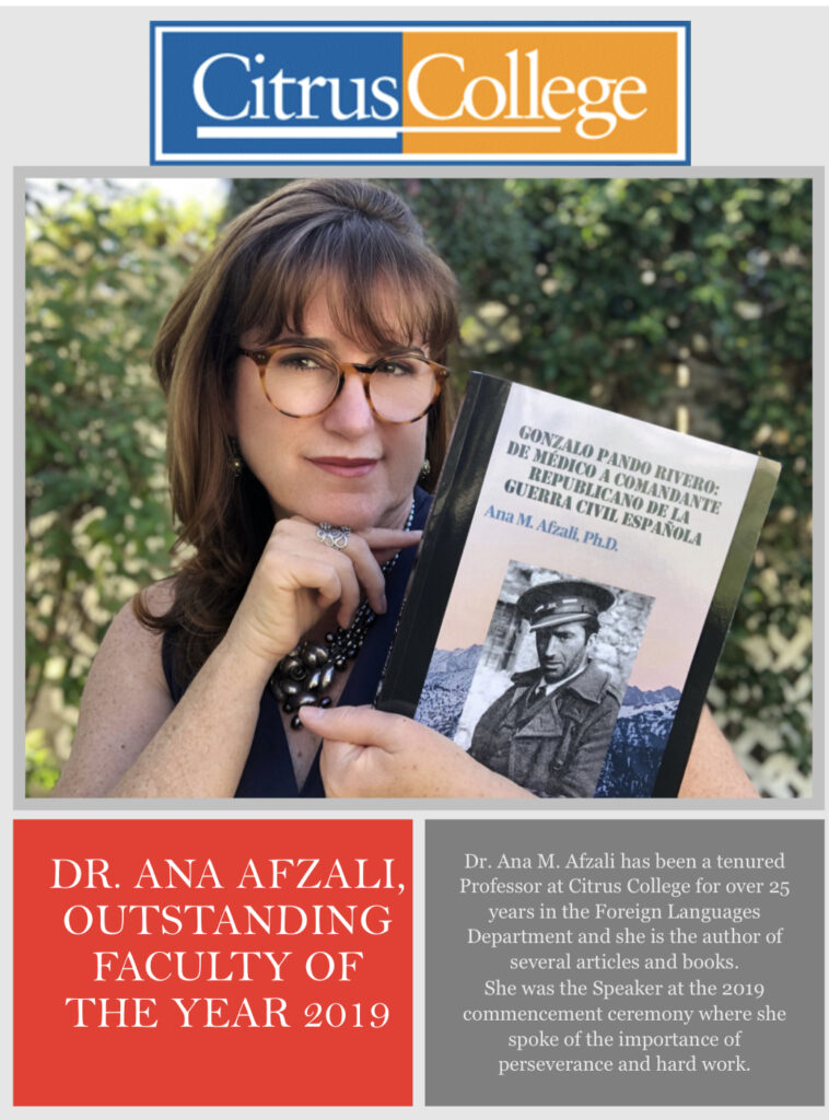 Upon joining Citrus College as a full time Tenured Professor, Dr. Afzali pioneered the creation of two courses of Spanish for Heritage Speakers and a Spanish History course. Her innovative methodology, her extensive knowledge about Spanish history, culture and grammar, and her years of experience in the field of teaching constitute indispensable ingredients for the success of her courses.
